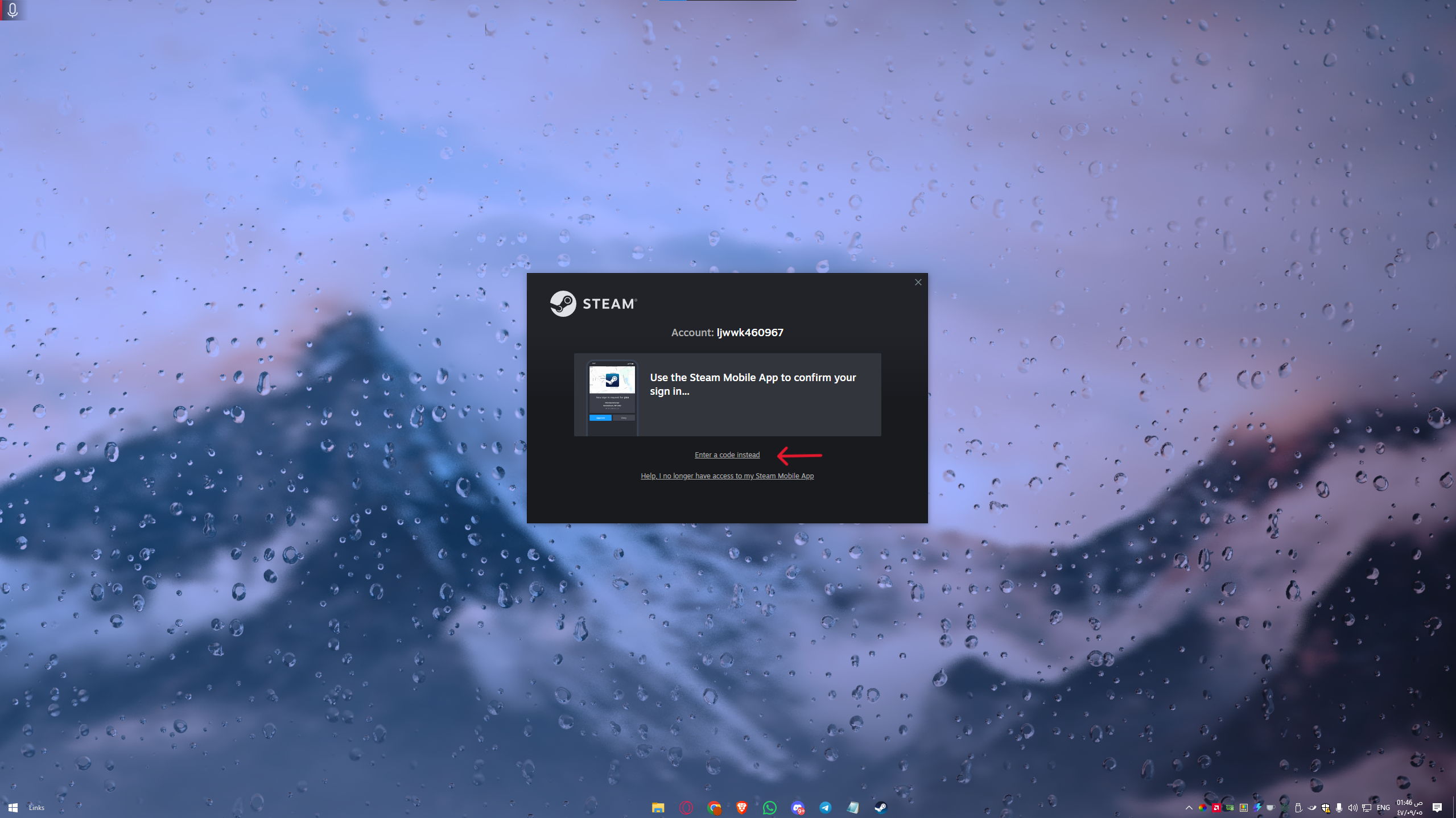 : عند فتح الحساب، سيطلب منك نظام الحماية التأكيد. اضغط على خيار "Enter a code instead" المشار إليه بالسهم الأحمر.