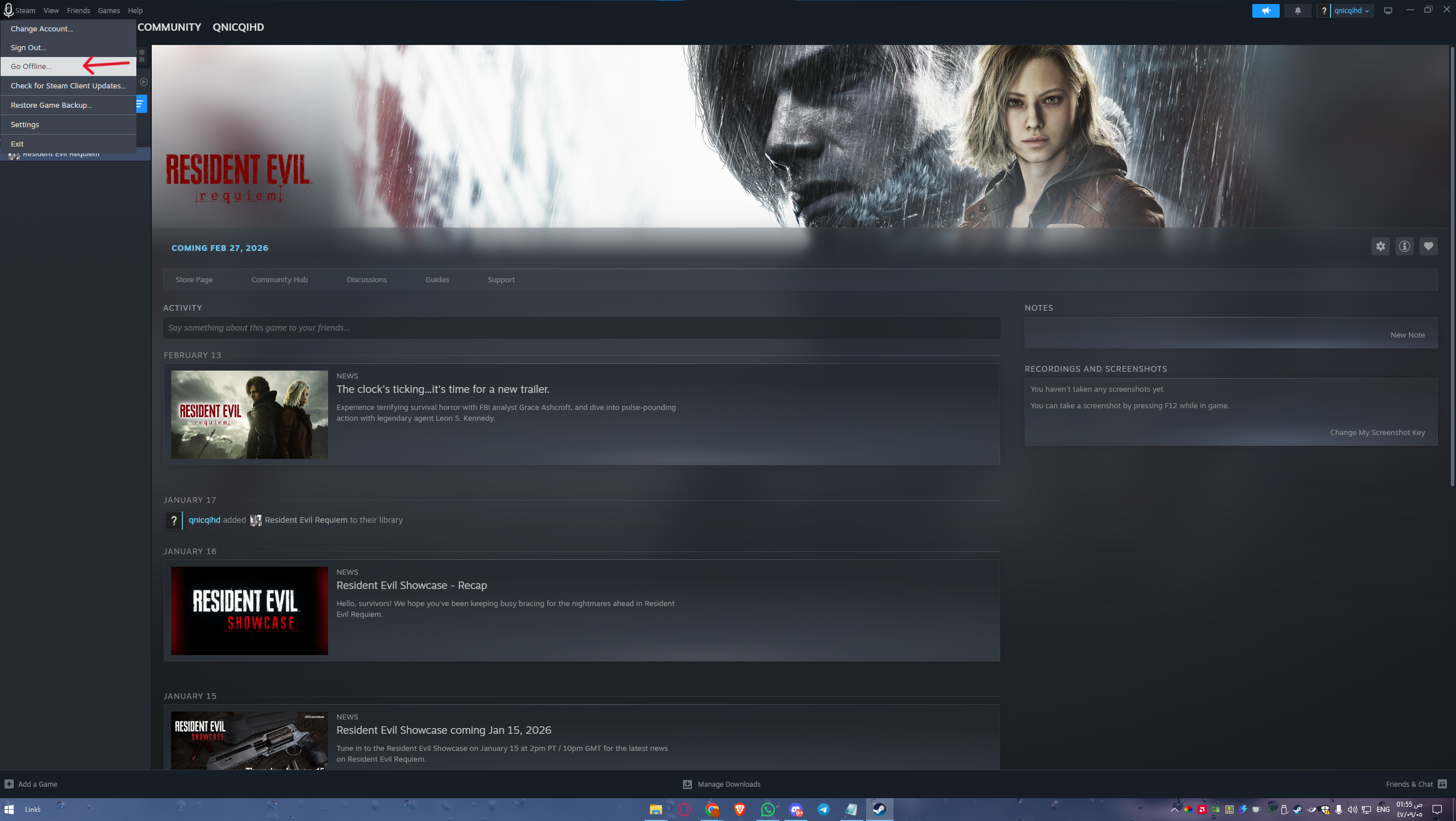 - ارجع لنافذة ستيم، اضغط على كلمة Steam في الأعلى، ثم اختر Go Offline....